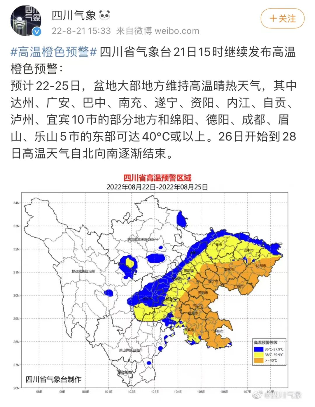 预计22~25日,四川盆地大部地方维持高温晴热天气,其中达州、广安、巴中、南充、遂宁、资阳、内江、自贡、泸州、宜宾10市的部分地方和绵阳、德阳、成都、眉山、乐山5市的东部可达40℃或以上。26日开始到28日高温天气自北向南逐渐结束。