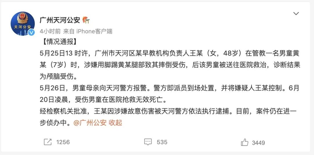 6月22日,广州市公安局天河分局发布关于“广州一早教机构负责人将幼童踢伤致死”的情况通报,全文如下: