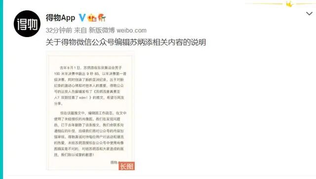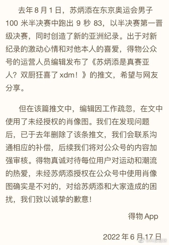 之后得物回应称,该起事件为去年8月,苏炳添在东京奥运会男子100米半决赛中创造了新的亚洲纪录,出于对苏炳添的喜爱,得物公众号运营人员编辑发布了《苏炳添是真赛亚人?双厨狂喜了xdm!》的推文。在该篇推文中,编辑因工作疏忽使用了未经授权的肖像图,在发现问题后,已删除了该条推文,公司会联系沟通相应的补偿,后续将对公众号的内容加强审核。