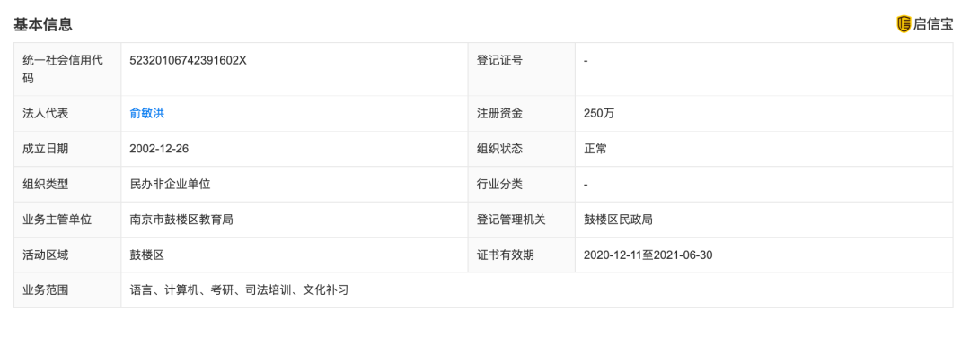 启信宝App显示,南京鼓楼新东方进修学校成立于2002年,法定代表人为俞敏洪,注册资金为250万元。