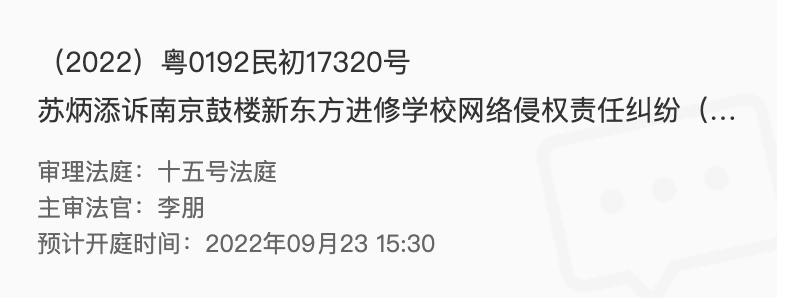近日,广州互联网法院网站显示,南京新东方新增案件开庭公告,原告为苏炳添,案由为网络侵权责任纠纷。该案将于9月23日在广州互联网法院开庭。