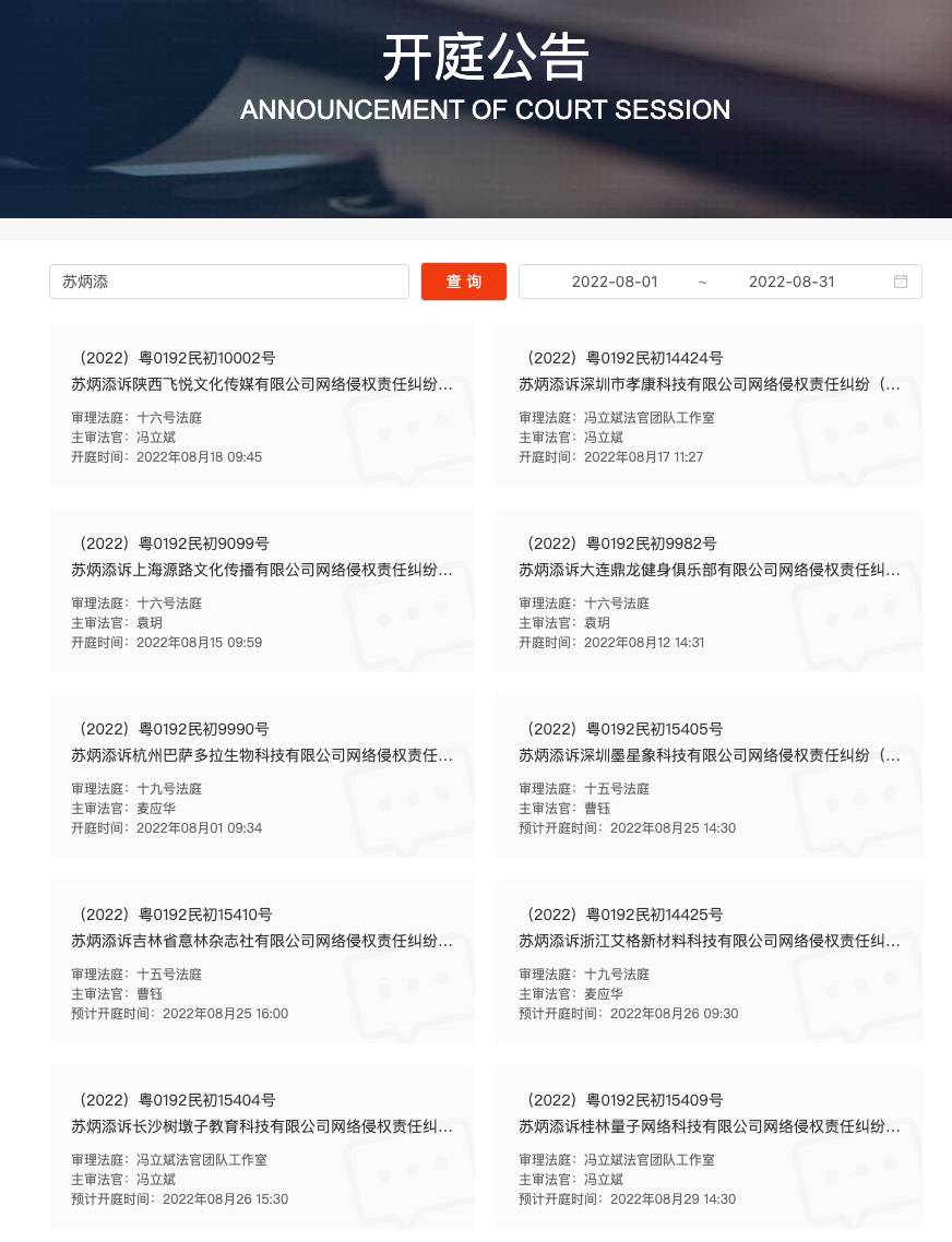 记者在广州互联网法院网站检索发现,从今年2月开始,以原告为苏炳添的网络侵权责任纠纷案件,2月有20件,3月有21件,4月有10件,5月有2件,6月有26件,7月有13件,8月有6件、另有5件待开庭,9月还有32件待开庭,10月3件待开庭。