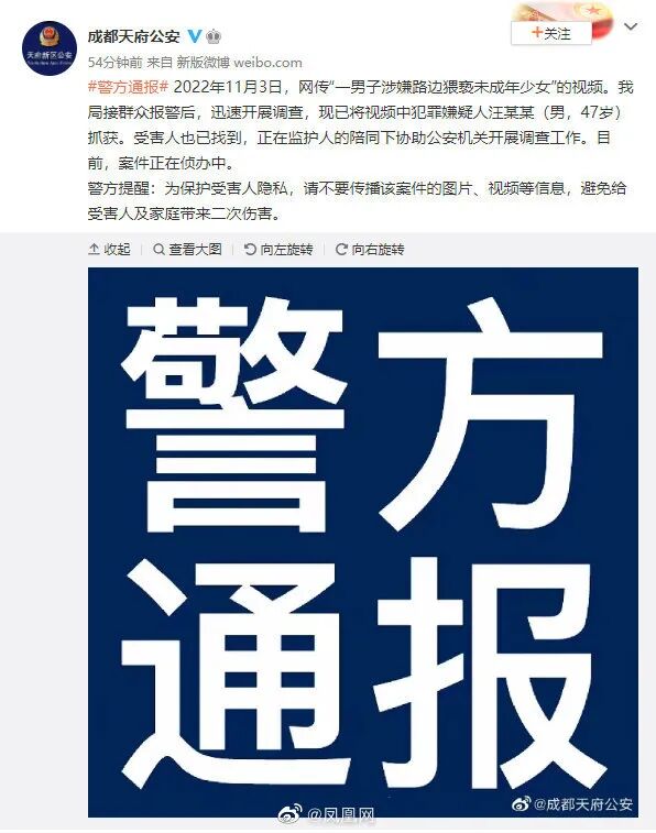 2022年11月4日,成都市公安局天府新区分局发布警方通报:2022年11月3日,网传“一男子涉嫌路边猥亵未成年少女”的视频。我局接群众报警后,迅速开展调查,现已将视频中犯罪嫌疑人汪某某(男,47岁)抓获。受害人也已找到,正在监护人的陪同下协助公安机关开展调查工作。目前,案件正在侦办中。警方提醒:为保护受害人隐私,请不要传播该案件的图片、视频等信息,避免给受害人及家庭带来二次伤害。