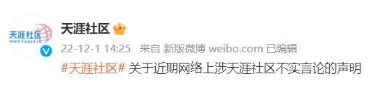 12月1日下午14时25分,@天涯社区 发布《关于近期网络上涉天涯社区不实言论的声明》: