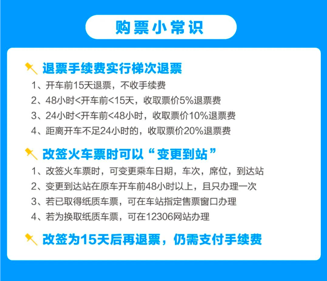 三是因铁路责任或不可抗力造成旅客退票,联程车票可一并办理退票,而且免收退票手续费。旅客在办理补票、变更等业务时,不再收取手续费;同时扩大非高峰方向票价折扣优惠列车范围。