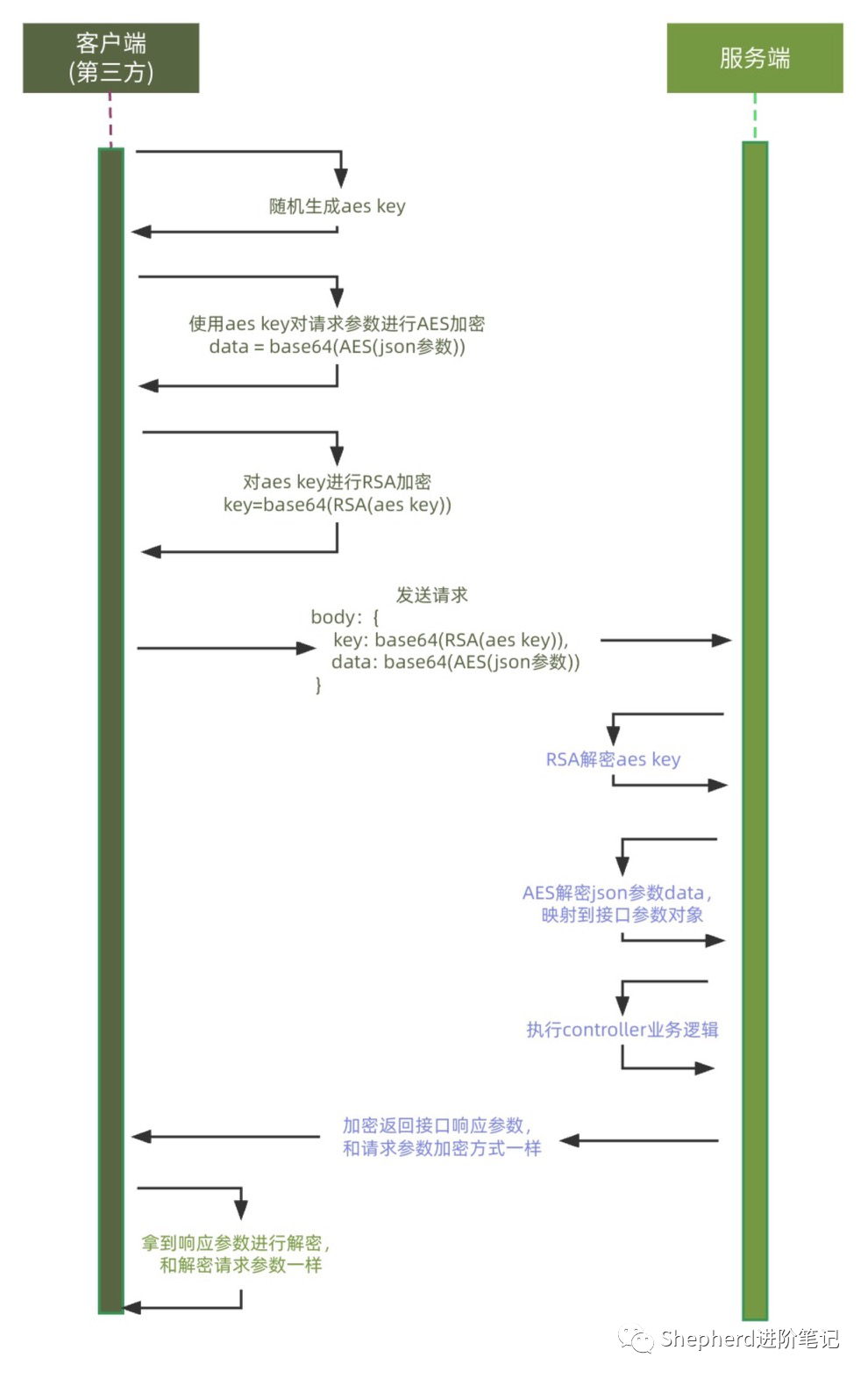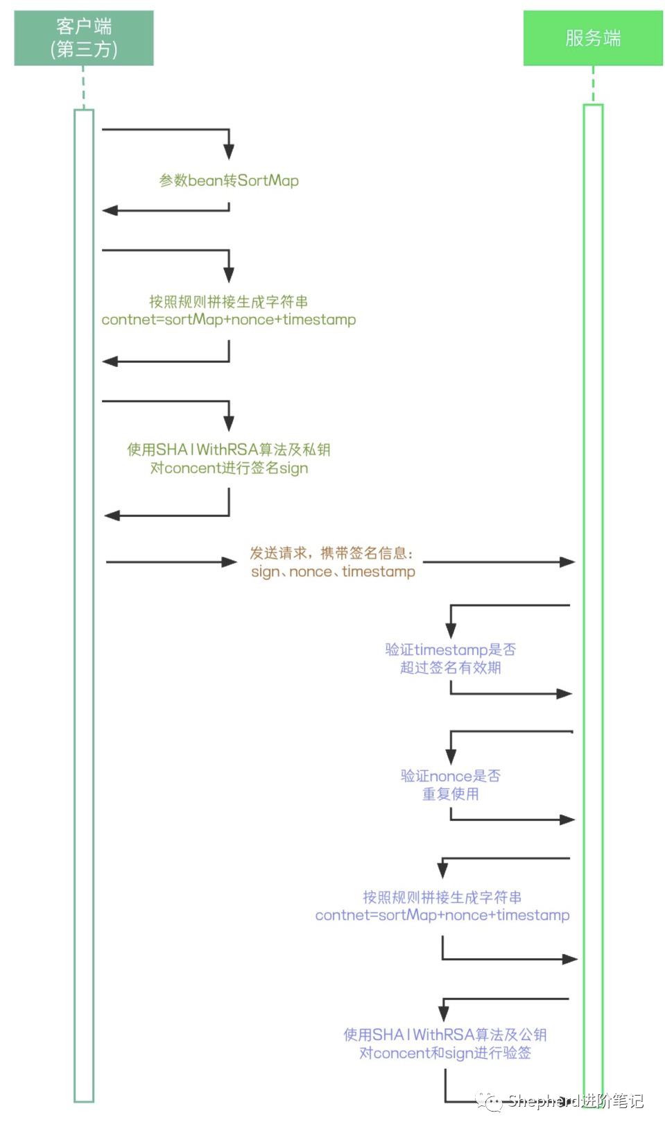 aes key对接口参数requestBody进行加密,data=base64(AES(json参数))aes key,有效保证aes算法的密钥的可靠安全性 key=base64(RSA(aes key))ase key, 再通过aes key解密data得到真正json参数,最后映射到接口方法的参数对象上,供controller的业务方法逻辑使用。签名验证也是当下提高接口安全性主要措施之一,核心就是客户端在调用接口时按照一定规则生成签名sign,服务端拿到签名sign之后进行验证操作,大致流程如下: