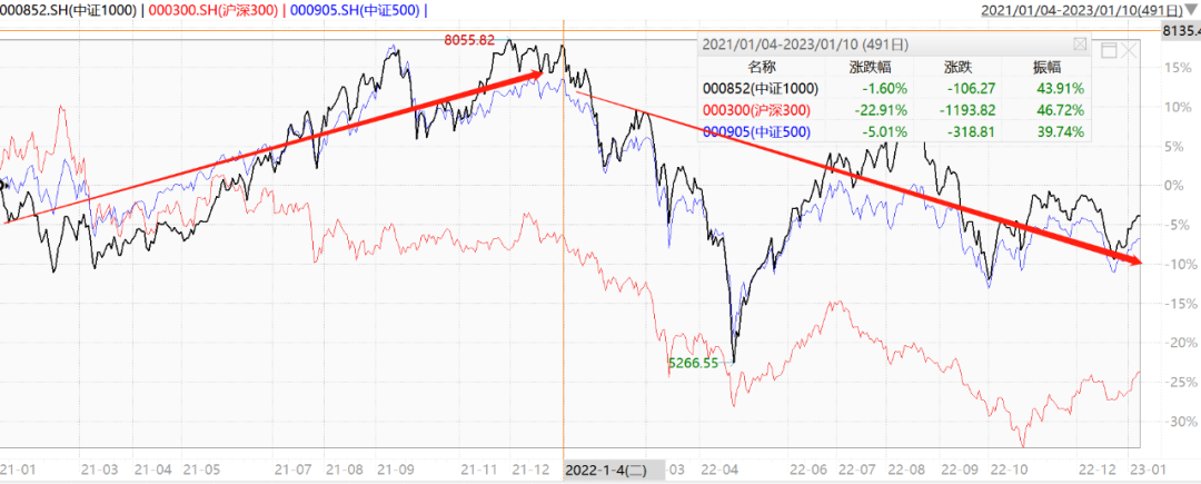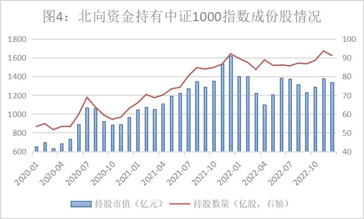 本轮中小盘行情从2021年2月开始,并贯穿2021全年,还没来得及进一步展开,就被2022年的熊市打断了节奏。虽然2022年小盘也跑赢了大盘,但是也还是负收益。下图为2021年以来3大指数走势对比机构目前应该还是比较看好小盘的,从公募基金来看,重仓中证1000指数成份股的比例呈上升趋势。2022年三季报显示,全部公募基金十大重仓股中属于中证1000指数成份股占全部公募基金重仓总市值的比例从2020年一季度的8.3%提升到了9.8%。仅2022年三季度,占比上升超过了1个百分点。另一方面,北向资金持有中证1000指数成份股的市值与数量也在持续提升,2020年1月末北向资金持有指数成份股市值仅653亿元,到2022年12月已提升至1337亿元,持股数量从53亿股提升至91亿股。