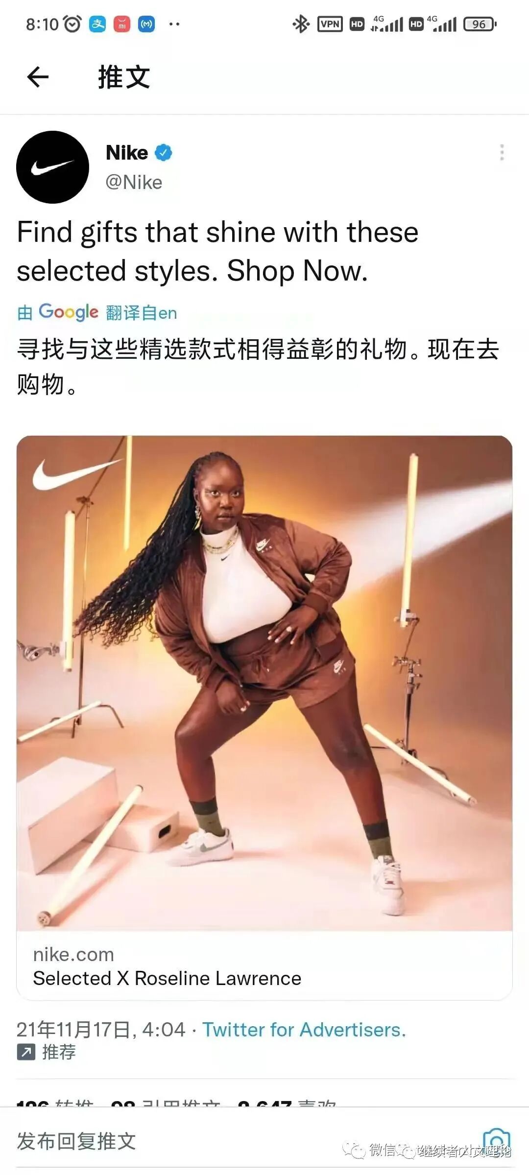 ——美国耐克公司推出了“巨肥”黑人变性人模特,可谓把犹太文化马克思白左buff叠满:黑命贵+女性(对应女权)+LGBTQ之变性人……