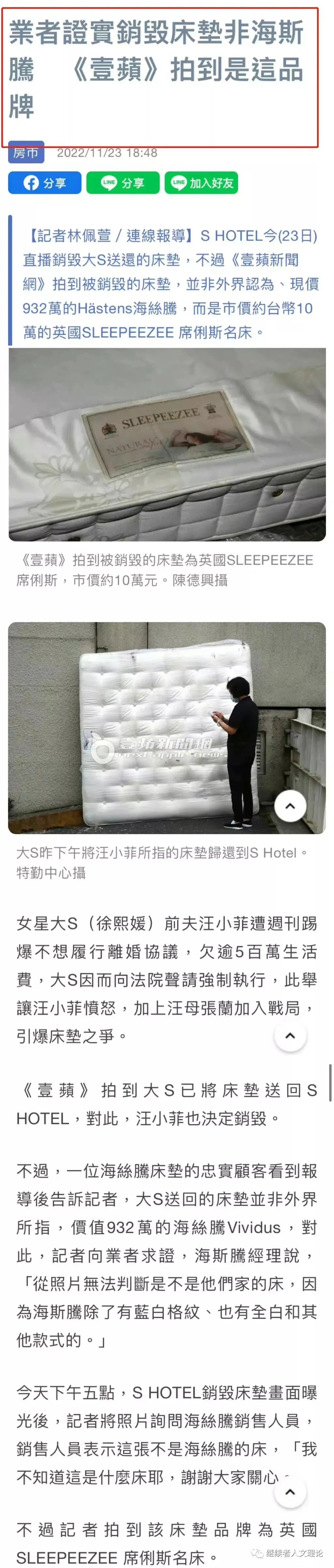 然后有媒体报道大S把一个床垫运到了s hotel还给汪小菲(这家酒店是当初汪小菲为了大S开的,还专门命名为S hotel)