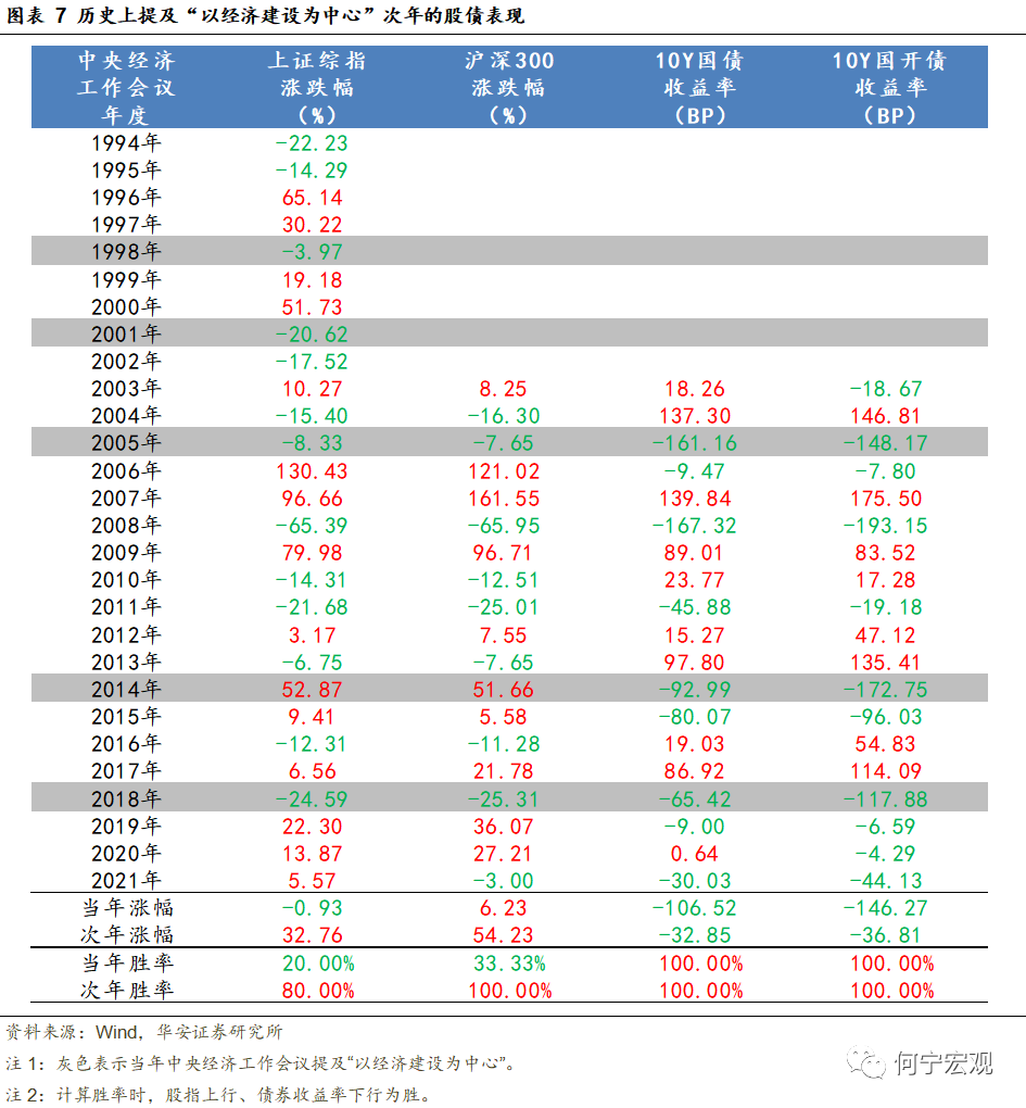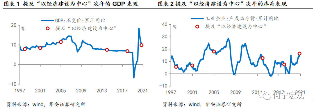 2、以史为鉴:回顾历史上中央经济工作会议提及“以经济建设为中心”的年份,次年经济增速有升有降,库存大多处于见顶回落期,多有降准降息,实际赤字率有升有降,固定资产投资短线冲高,基建逆周期拖底效果不明显;资产表现方面,次年稳增长政策的落地刺激经济回暖,股市由跌转涨、利率下行幅度收窄。