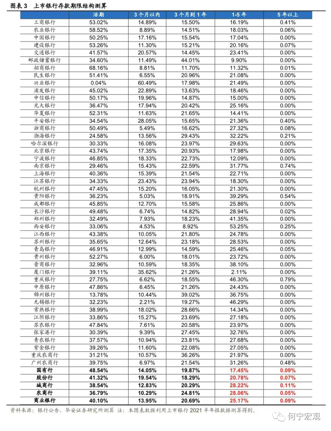 首先,测算分银行性质的存款期限结构。我们利用46家A股和H股上市银行的2021年半年报数据,测算分期限存款规模(即期、1个月以内、1-3个月、3个月-1年、1-5年、5年以上等),测算表明国有银行(6家)、股份制银行(10家)、城商行(21家)以及农商行(9家)2年以上定期存款占吸收存款总额比重分别为17.55%、20.85%、28.33%、28.11%。