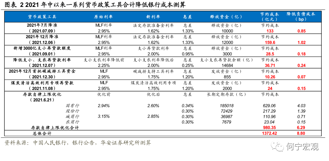 1、2021年7月和12月央行两次下调金融机构存款准备金率0.5个百分点,共释放资金约2.2万亿元,减少银行负债端成本约1.9bps。