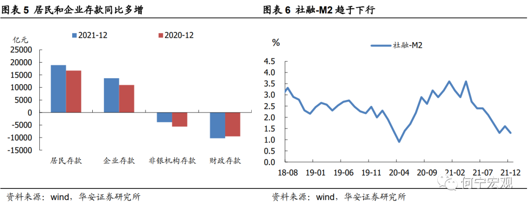 12 月 M1 同比回升 0.5 个百分点至 3.5%,M2 同比回升 0.5 个百分点至 9.0%。其中:M1 同比回升与基数下行有关,也可能反映了地产边际宽松、票据高增、碳减排工具落地、支小支农再贷款降息等改善了企业的现金流。从“贷款创造存款”的角度看,贷款增速下行与 M2 增速上行有一定背离,这应是部分受 M2 基数下行的影响,也可能反映了居民消费和企业投资意愿较低,而储蓄意愿增强,从存款端的居民、企业存款均同比多增也能得到印证。此外,社融-M2 仍趋下行,反映实体融资需求仍未显著改善。财政存款减少 1 万亿,同比多减 762 亿元,反映财政支出加快。