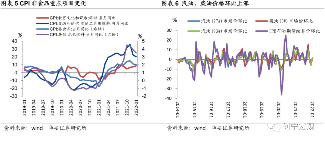 2、非食品项:非食品环比由降转升,主因油价上升、节前出行增加且服务需求加大;春节家庭服务和通信工具价格显著上升且环比涨幅高于季节性;冬季服装需求开始下降,服装CPI随之下降;旅游环比回升,但幅度低于季节性,反映节前出行增加,但也受到了疫情的扰动。