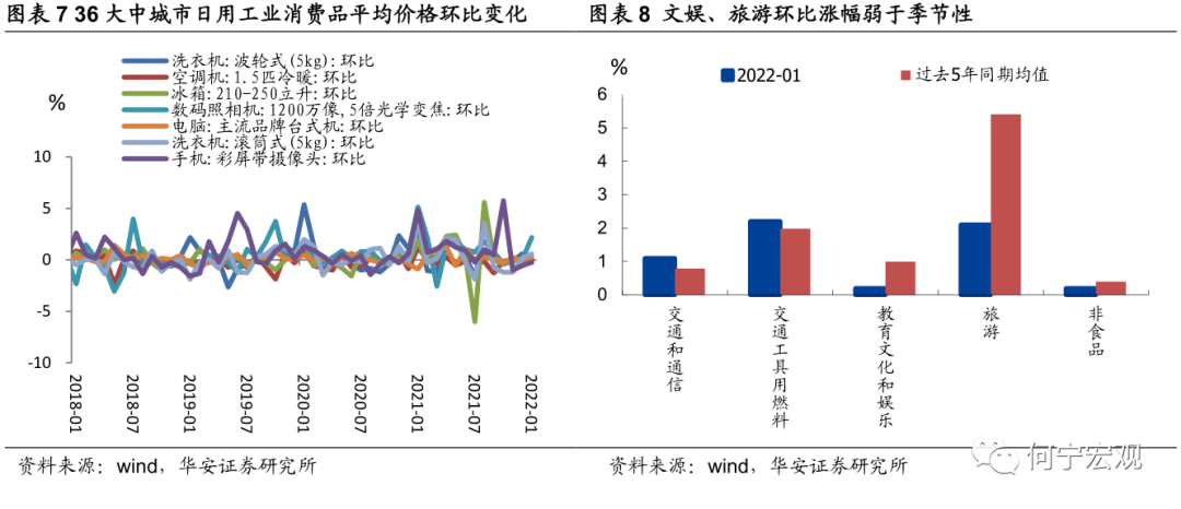 2)环比略低于季节性的是服装、家用器具、房租等价格,其中服装可能与冬季服装需求旺季已过有关;家用器具方面,1月36大中城市日用工业消费品平均价格内部分化,其中照相机环比涨幅上升2.11个百分点,滚筒洗衣机、手机、电脑价格环比涨幅上升幅度均扩大0.3个百分点以上,而波轮洗衣机、空调、冰箱较上月环比跌幅分别为0.853、0.031、0.138个百分点;房租CPI环比下降0.2%,可能与1月疫情再度多点复发、就业压力难以缓解有关;旅游CPI明显低于季节性,但环比上升2.1%,说明节前出行及返乡确实拉高了旅游价格,但受疫情多点复发影响,与往年相比价格提升有所不足;