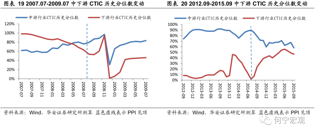 2、特点二:价格传导能力边际增强,部分下游行业今年可能迎来“困境反转”。图19-22显示历史上的PPI见顶时候,下游行业CTIC往往触底,也就意味着当PPI上行期结束的时候,下游行业的价格传导能力有所加强,部分行业存在“困境反转”的可能。首先,根据PPI当月同比划分六轮周期,其中四轮周期下游CTIC在PPI见顶回落时有所好转。完整周期下,2007年7月-2009年7月,2012年9月-2015年9月,2015年9月-2020年5月,2020年5月至今,以上四个周期中均能够发现下游行业CTIC在PPI同比见顶回落后开始好转攀升,在第六轮周期中中游行业CTIC也表现出了掉转回升的趋势。其次,再回看图17,去年食品制造业、纺织业、木材加工、家具、印刷、橡胶塑料、汽车制造等行业已经体现出一些“困境反转”的迹象(即CTIC趋势回升,下半年回升明显);但是仍有部分行业CTIC在2021年全年仍处于历史分位数的底部,未来可能存在“困境反转”的可能性,如酒、饮料和精制茶制造业、纺织服装服饰、皮革制品和制鞋业、造纸和纸制品等。