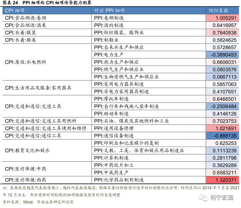 3、特点三:通过PPI和CPI一对一传导测算,我们发现某些行业价格传导本来就很顺畅,那么可能存在结构性消费涨价机会,如图23-24显示PPI向CPI细项价格传导效果较好的行业有烟酒制造、纺织服装、服饰业、通用设备修理业、化学药品制剂制造业等;图25显示CPI向PPI传导主要表现在农产品向食品加工业的传导,除水产品和蛋类外,其他细项向PPI传导普遍较好。因此,总体看,可关注烟酒、食品加工、纺服、西药等可能的涨价。