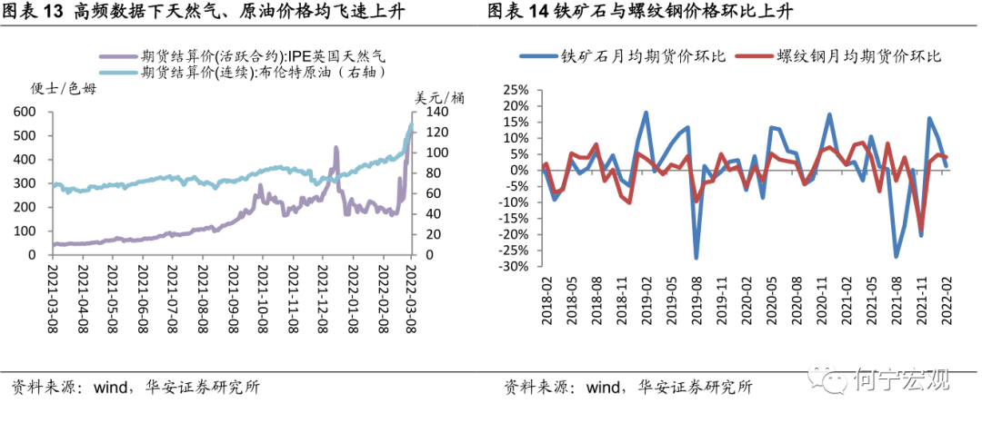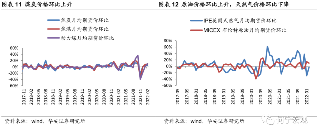 5)天然气期货月均价格环比小幅下跌3.61%,电力热力生产和供应业价格环比上涨0.9%,但燃气生产和供应业环比下跌0.2%。天然气期货价格高频数据显示,2月22日起天然气价格受俄乌冲突影响大幅攀升,3月7日达到539.53便士/色姆的高点,预计3月天然气环比价格仍会走高。