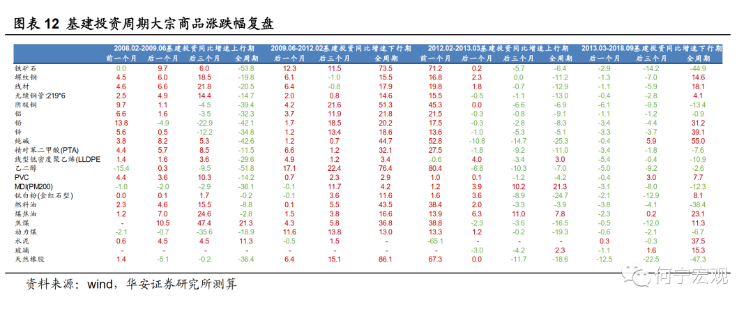 1)基建发力较容易带动有色金属与化工类大宗商品上行,以史为鉴,基建对工业品价格的拉动普遍会提前反应,但并不持久。对历史复盘发现:持续时间方面,在基建投资增速的上行期前一个月,市场预期到基建发力,大宗商品价格普遍上升;上行期开始后一个月,部分大宗商品价格上涨乏力,铁矿石、螺纹钢、线材、阴极铜、线型低密度聚乙烯(LLDPE)、煤焦油价格涨势依旧坚挺;后三个月,大部分大宗商品价格开始下行;到达上行周期结点时,大宗商品需求即将见顶,大宗商品价格较基建上行初期普遍下跌。品种方面,新老基建各有相关拉动,关注有色金属、化工类和钢铁。(参考图表10、12)。