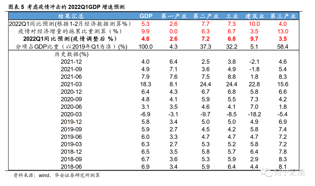 4、根据3月PMI测算疫情对一季度经济的拖累,可能为0.5个百分点。我们以制造业PMI中的生产指数、PMI建筑业和PMI服务业指数偏离季节性均值的程度,来衡量疫情对三月第二产业和第三产业的冲击,测算表明3月工业、建筑业、服务业较季节性的偏离度约为6.7%、3.5%和13%,将此作为代理指标,衡量疫情对各行业增量的影响比重。在报告《如何理解超预期的经济增速?》中我们以1-2月经济数据为主要参考,测算一季度GDP同比的基准情形是5.3%。将前述各行业偏离度指标进行加权,并在基准5.3%基础上增加一个向下冲击,这个冲击约为0.5个百分点,则调整后的一季度GDP同比增速约为4.8%。(请见图表5)