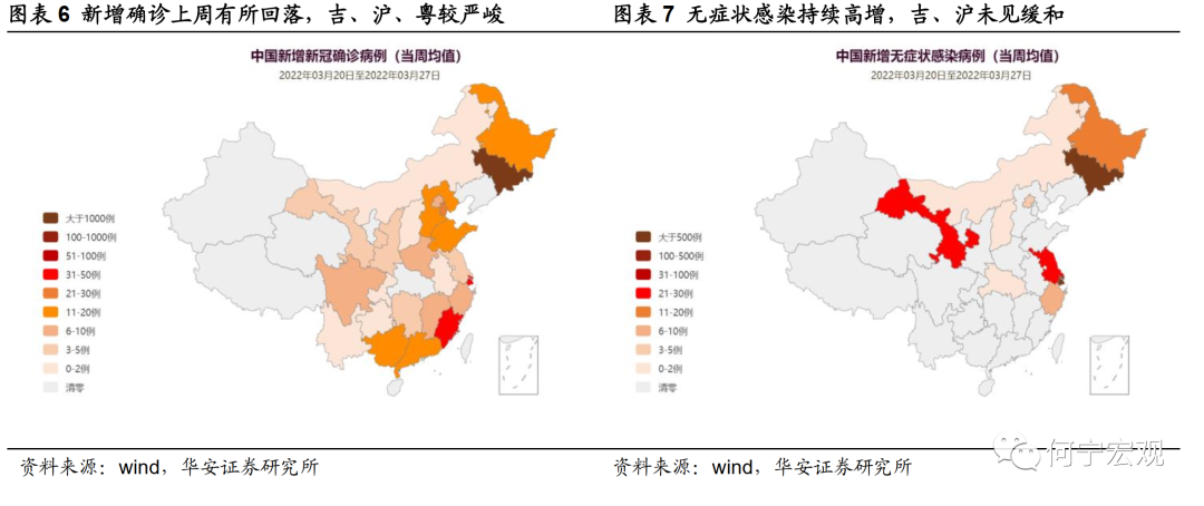 3月疫情蔓延呈点多、面广、频发特征,本月(截至3月29日)全国新增确诊病例39751例、上周出现小幅回落,其中吉林、广东较为严峻;新增本土无症状感染61685例、目前仍呈持续增长态势,上海、吉林未见缓和。动态清零政策下,防控措施持续升级,包括吉林、深圳和上海先后实施了严格封锁,预计消费受创较重,投资和生产有小幅拖累。