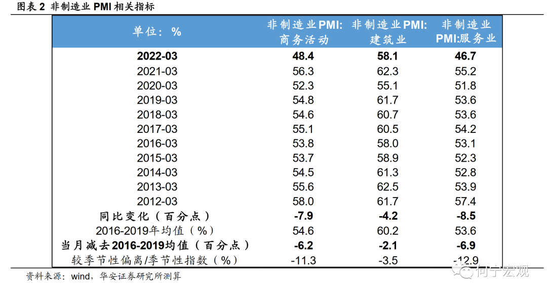 2)非制造业:3月非制造业PMI商务活动指数环比回落3.2个百分点至48.4%,重回荣枯线以下,且这一水平基本回至2021年8月,较2021年同期大幅回落7.9个百分点,也比2016-2019年同期均值低6.2个百分点。具体看,服务业PMI大幅回落,建筑业PMI小幅回升。疫情对服务业PMI的超季节性拖累达到6.9个百分点,地产销售低迷、接触性服务业景气度急剧下滑。建筑业景气度较2月小幅回升,但受疫情影响,3月表现仍低于季节性,我们继续看好后续基建对稳增长的拉动作用。
