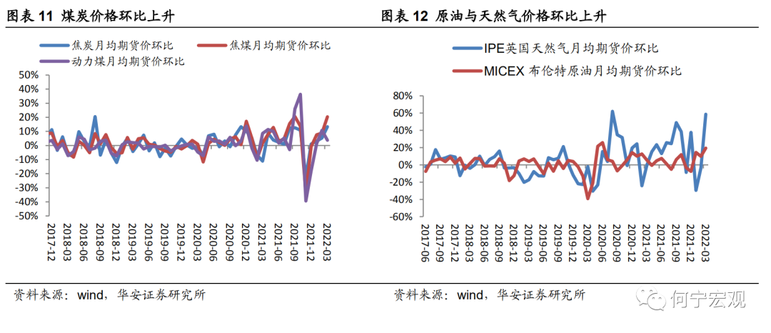1)煤炭价格涨幅继续扩大拉动煤炭产业链。煤炭价格环比涨幅全线上涨,焦煤、动力煤分别环比上升20.41%、3.70%,带动煤炭开采和洗选业价格环比由跌转升,涨幅扩大4.9个百分点至2.5%。4月7日至8日,美英日以及欧盟对俄制裁加码,其中包括禁止俄罗斯煤炭进口,欧盟给成员国120天时间逐步减少直至停止俄煤炭进口。国际煤炭供给受到冲击,国内方面,3月28日国家发展改革委印发通知,进一步完善煤炭市场价格形成机制,强调引导煤炭价格在合理区间运行。在国内外多因素的扰动下,我们预计4月煤炭价格会继续走高,需要关注国内政策实施力度。