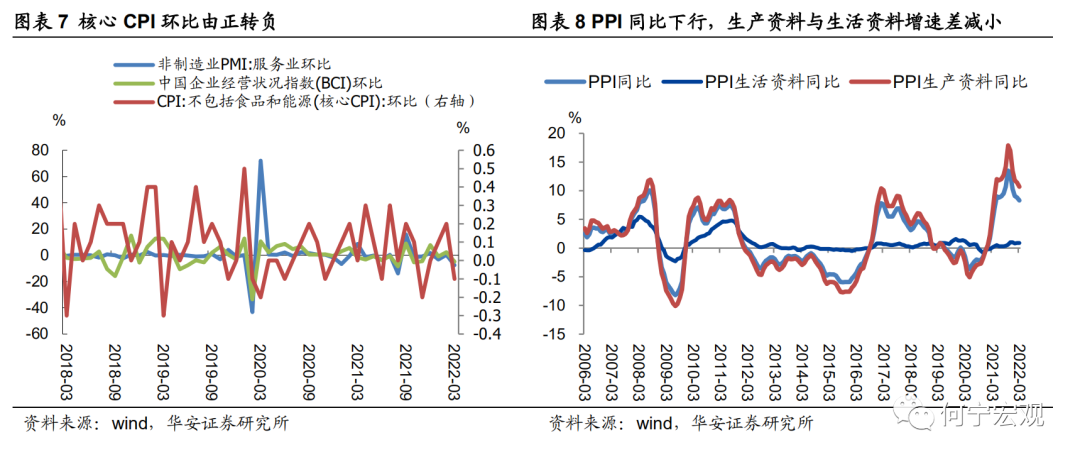 3、核心CPI:经济景气较上月下降,核心CPI环比下跌0.1%,同比持平前值1.1%。3月核心CPI环比由正转负,下跌0.1%,但高于剔除疫情影响的季节性0.03个百分点。受疫情冲击,3月制造业PMI、服务业PMI、BCI指数较上月均下滑,经济承压。需求总体仍然疲弱,3月核心CPI同比持平前值。
