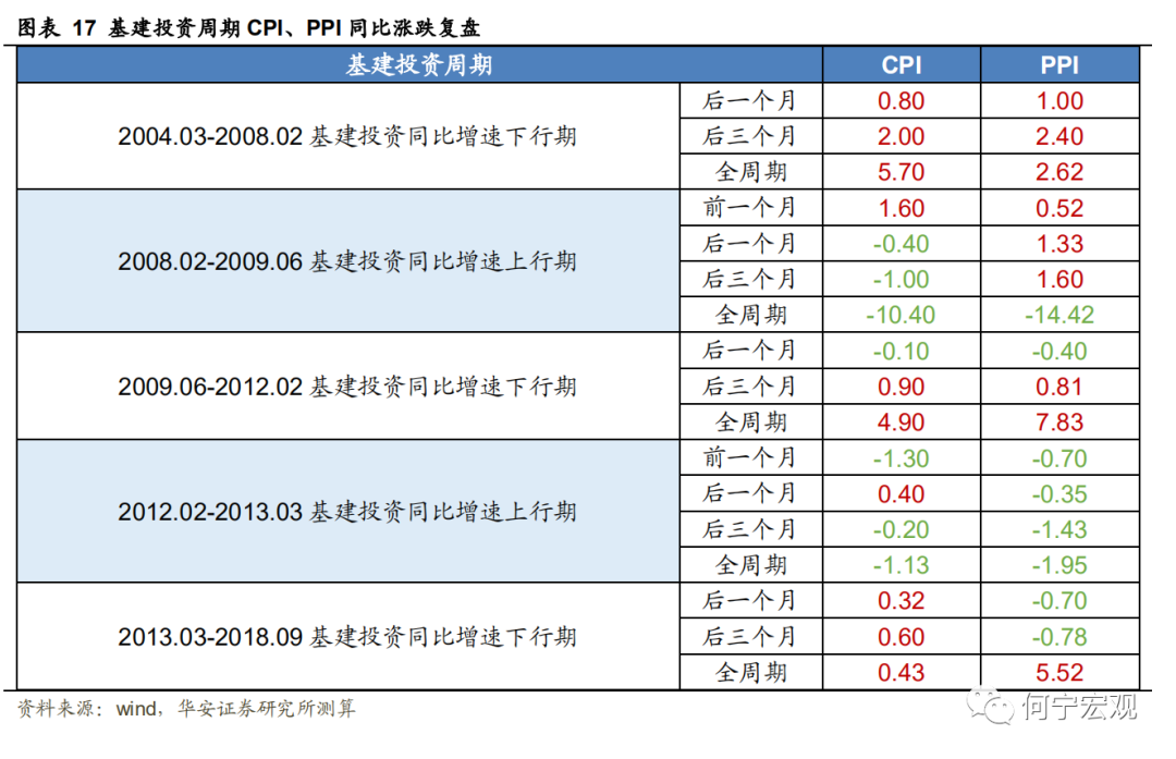 1、在基建投资上行期(2008.02-2009.06、2012.02-2013.03),CPI同比在周期开始后三个月以及周期结束时低于期初CPI同比,周期结束时PPI同比基本低于期初同比;