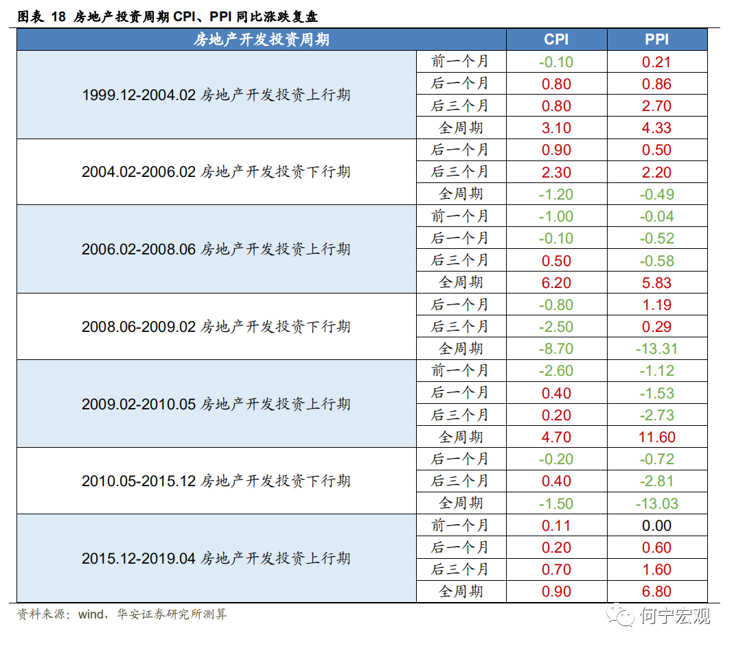 2、房地产投资上行期(1999.12-2004.02、2006.02-2008.06、2009.02-2010.05、2015.12-2019.04)CPI同比普遍在周期开始后一月、后三个月以及整个周期内上升,周期结束时PPI同比基本高于期初同比。