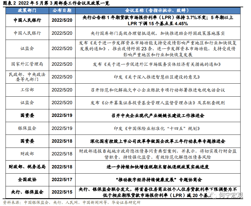 本文内容节选自华安证券研究所已发布报告:《稳增长将步入2.0阶段——2022年5月第3周政策跟踪》(发布时间:20220522),具体分析内容请详见报告。若因对报告的摘编等产生歧义,应以报告发布当日的完整内容为准。