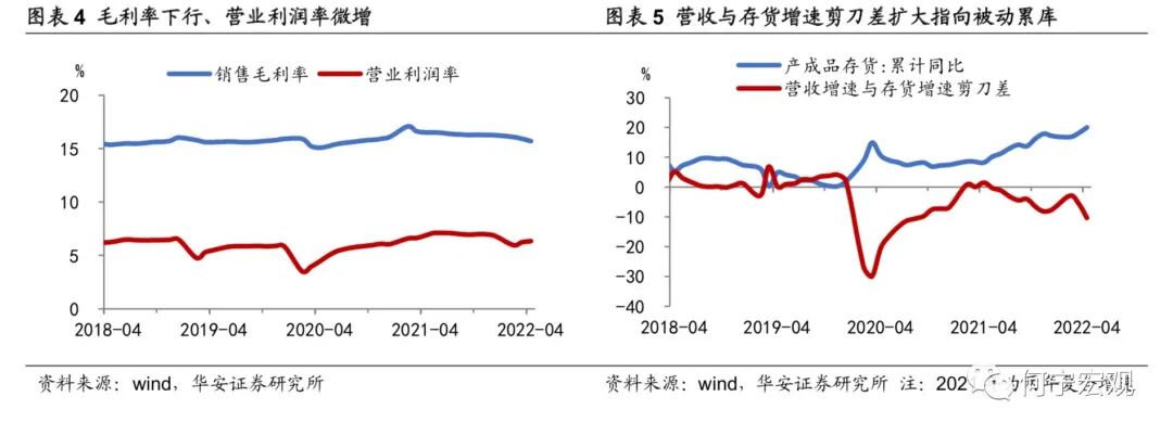 2)利降。2022年1-4月工业企业利润总额累计同比5.0%、较1-3月的8.5%下滑了3.5个百分点,经测算4月利润当月同比约为-8.5%、远低于3月的14.0%。疫情冲击下销售毛利率有所下滑,而营业利润率受益于减税降费的落实落细、呈边际改善趋势;1-4月销售毛利率为15.7%、较前值下滑了0.2个百分点,1-4月营业利润率为6.4%、较前值上行了0.1个百分点。