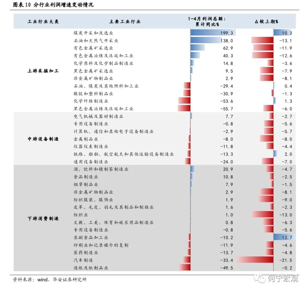 1)从利润占比来看,工业企业呈“上游升、下游降”的利润分配格局,印证了我们此前的判断(详见《内外冲击下企业利润结构更趋分化》)。1-4月上游采掘加工、中游设备制造、下游消费制造利润占比分别为50.6%、22.5%、26.6%,较前值变动2.0、0.3、-2.3个百分点。