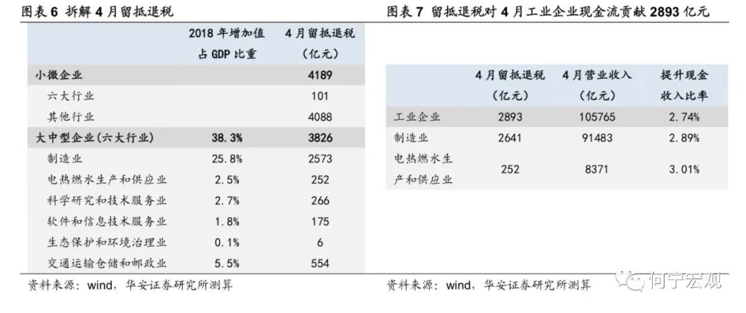 4月制造业、科研和技术服务业等六个重点支持行业获得退税3927亿元,我们根据2018年全国投入产出表测算制造业、电热燃水生产和供应业增加值分别占GDP的25.8%、2.5%,则4月工业行业获得退税额为2893亿元,提振现金收入比率2.7个百分点。向后看,5月、6月是制造业等六个行业中型、大型企业集中退税的时间段,工业企业现金流表现有望逐步修复。