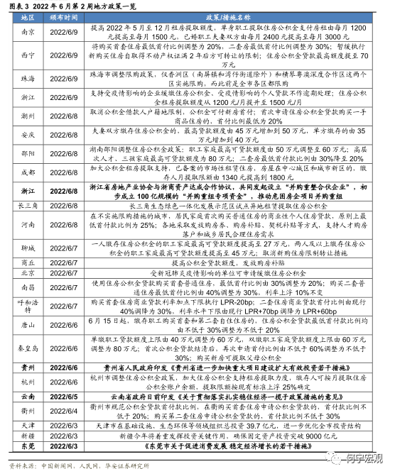 本周(6月3日-6月10日)地方政策方面,重点聚焦地产、稳增长与促消费。地产方面,本周近二十个城市继续出台系列楼市松绑政策,其中提高住房公积金贷款额度、降低首付比为主要调控措施。从城市层面来看,浙江省调控力度较大,一方面,加大住房公积金租房提取力度,另一方面省房地产协会与企业共同成立“并购重组专项资金”,推动危困房企项目并购重组。稳增长方面,四省份出台贯彻落实国务院扎实稳住经济一揽子政策措施方案,多个城市发布促消费政策。