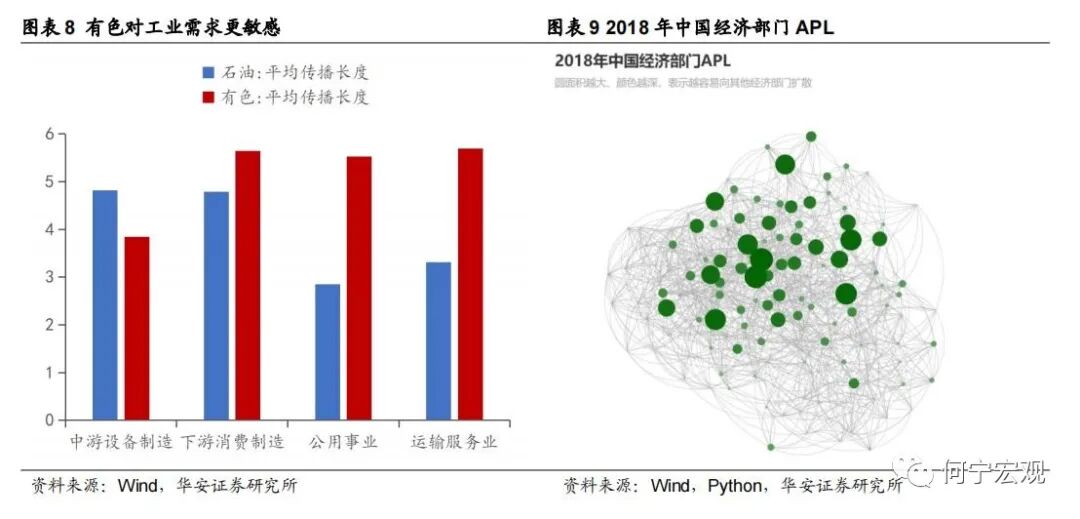 我们基于2018年的中国投入产出表测算了149个部门之间的APL,有色金属与中游设备制造业距离较短、APL为3.77轮,而石油与整体的制造业均距离较远,与中游设备制造、下游消费制造的APL分别为4.82轮、4.79轮,石油主要与公用事业、运输服务业距离较近。工业生产作为经济需求中周期性最强的部分,有色金属与制造业APL较低表明其能更快反应中游需求,因而在大宗商品中体现为铜价先于油价回落。换句话说,恰恰因为有色金属与工业生产平均传播长度较短,在经济下行期间,铜价回落能带来中游更大的利润弹性。