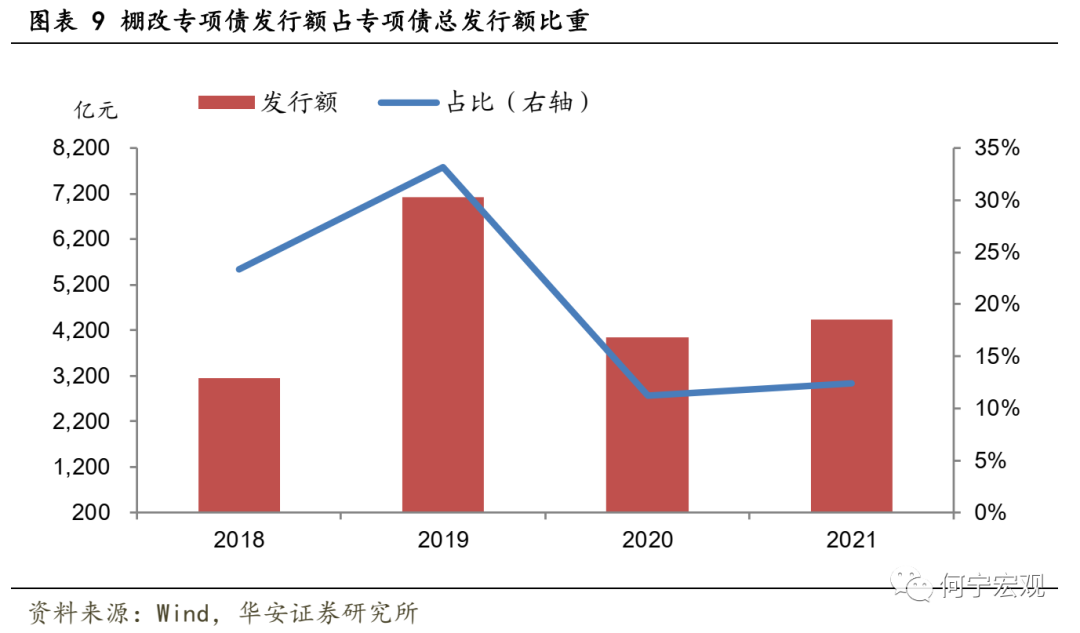 2.专项债能否用于稳定房地产市场还需观察。今年房地产市场风波再起,低迷的现状引起市场对于下半年棚改专项债的猜测。棚改专项债于2018年开始试点,主要是地方政府为棚户区改造募集资金而发行。近年来用于棚户区改造的专项债券有一定规模,2019年地方政府发行棚改专项债达到当年新发行专项债的30%,但在2020年初监管部门对棚改专项债实行限制后,发行规模快速下降。2020、2021年棚改专项债发行额在4000亿元左右。在2020年5月,棚改专项债被重新允许发行,但不能用于货币化安置项目。