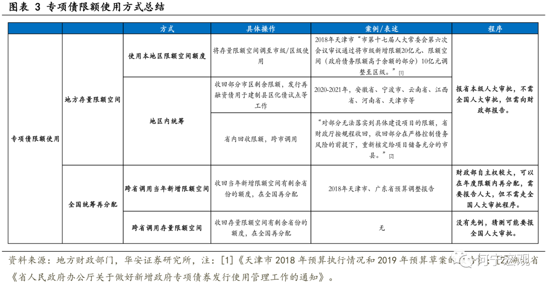 总结来看,专项债限额使用主要有两类可能情况,一是地方政府范围内使用限额空间,又分为直接使用和省内统筹再分配;二是跨省调用额度再分配,又分为新增限额和存量限额的调用。我们根据规模、流程、以及影响和效果,再具体分成三种情况。