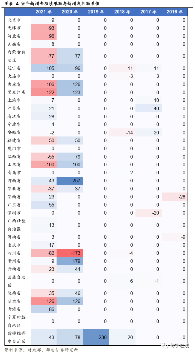 ① 2020年回收限额进行建制县区化债试点工作。2020年,部分市、区、县发布通知,根据财政部《关于收回部分地方政府债务限额的通知》(财预[2020]152号),当年市(区)政府债券限额被收回,年度限额进行相应调整。根据天津市静海区的表述“收回我区政府债务限额0.48亿元,并下达我区建制县区试点债限额40亿元(包括一般债务20亿元,专项债务20亿元),主要用于发行地方政府再融资债券偿还存量债务”。由于没有提到“新增限额”,我们判断回收的可能是地方的存量限额。且此次限额收回主要在省内范围实施,限额发行再融资债用于建制县区隐性债务化解工作。从今年的政策表述来看,专项债更多是用于支持基建,尽快形成实物工作量,从而稳增长。因此我们判断,今年与2020年限额使用的情况可能有所不同。