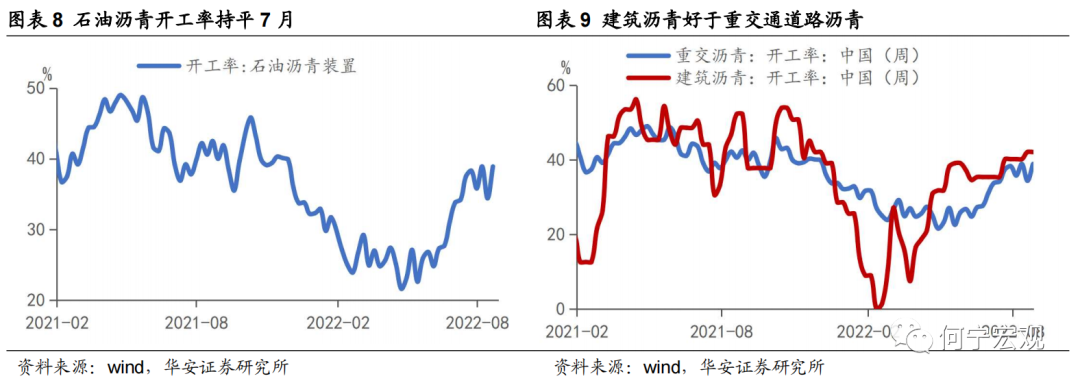 开工端,8月末水泥发运率为47.1%、水泥磨机运转率为43.3%,我们观察到水泥指标在本月第三周和第四周显著回落,一方面与四川等地限电限产有关,另一方面高温天气制约水泥制品的生产以及混凝土的施工作业;石油沥青装置开工率小幅改善至38.9%,其中建筑沥青好于交通道路沥青;7月主要企业挖掘机销量为3.4%、自2021年4月以来首次转正,挖掘机开工小时数同比-5.4%、较前值大幅改善了8.2个百分点。向后看,高温天气陆续退场,各地抢抓三季度施工旺季,基建高景气料将延续。