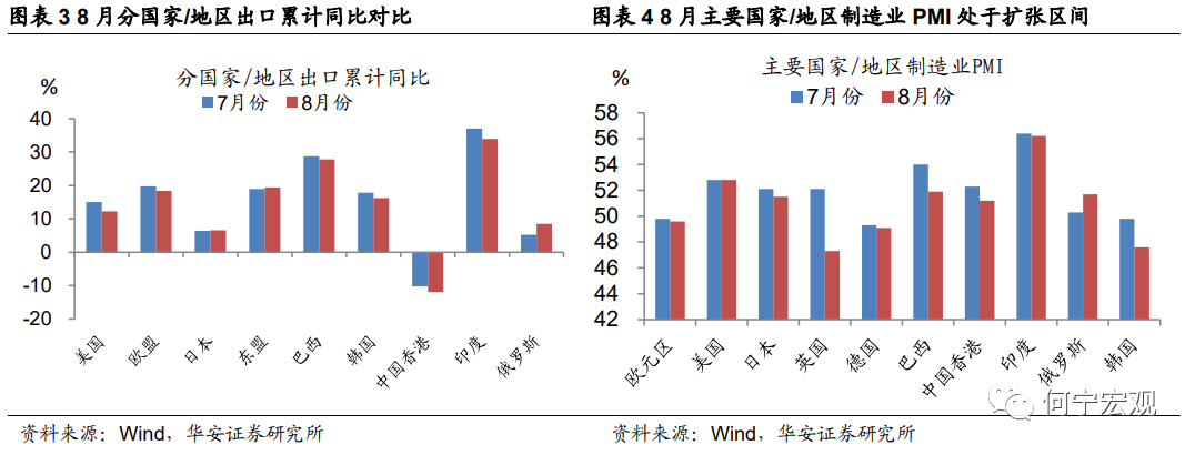2)分国别看:中国对主要国家出口增速多数有所下降。对发达国家出口增速大多下跌,8月仅对日本出口同比增速有所提升。新兴经济体中,对东盟和俄罗斯出口增速有一定上涨。