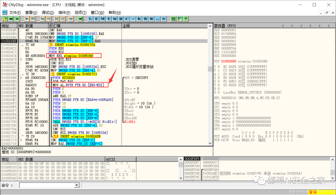 第八步:下面看看寄存器,其中EBX是基址寄存器,ESI是它的偏移量,猜测这个EBX基址寄存器和关键数据有关。