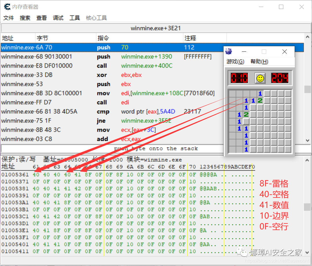 显示内容如下图所示,它同样和我们前面OD分析的内容一致。其中“8F”表示雷,“40”表示空格,“41”到“49”表示数字,“10”表示边界,同时“0F”表示隔一行。