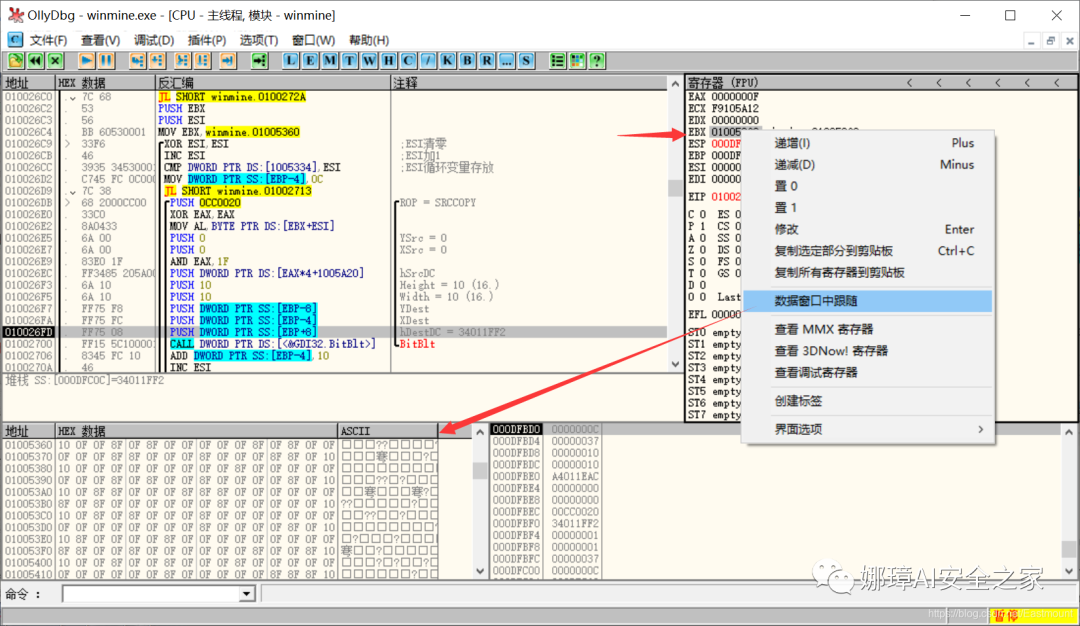 选择EBX基址寄存器,然后选择“数据窗口中跟随”,显示如下图所示的数据。