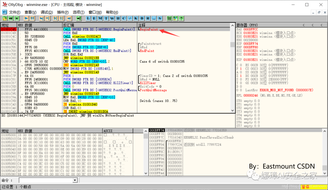 双击该断点会进入到反汇编窗口BeginPaint对应位置。