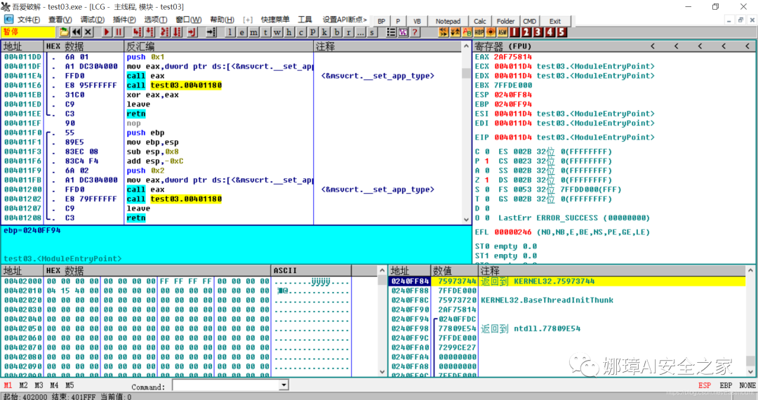 接着我们使用Ollydbg打开,在逆向分析中,动态分析(OD)和静态分析(IDA)非常多,动静结合也是常用的分析手段。后续两篇文章将介绍它们的基础用法。