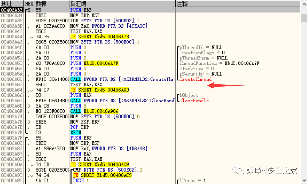 运行代码进入CALL函数,然后去到0x00406A33位置,如下图所示,发现它开启了一个线程。我们接着需要定位到线程的处理函数。