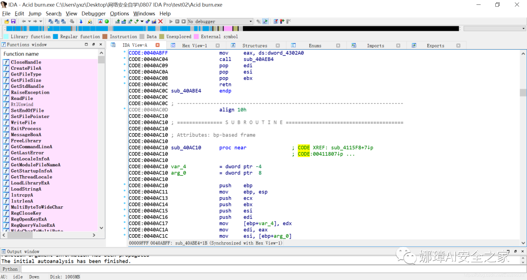 导出/入窗口:导出窗口列出文件的入口点,导入窗口列出由被分析的二进制文件导入的所有函数
