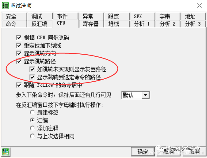 在“调试选项”->“CPU”->勾选“显示跳转路径”及“如跳转未实现则显示灰色路径”和“显示跳转到选定命令的路径”。
