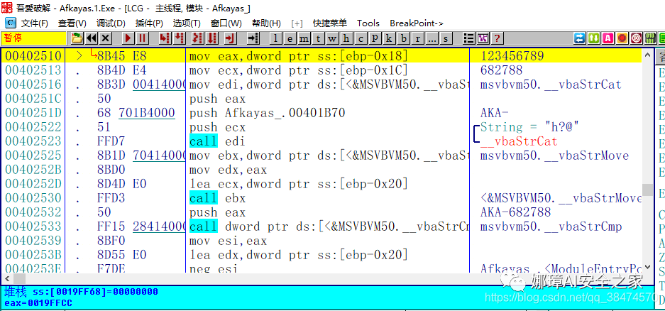汇编调用函数之前会先把参数入栈,然后用CALL指令调用函数。在字符串比较函数之前有一句 PUSH EAX 指令,可以推测这里的EAX就是字符串的首地址。